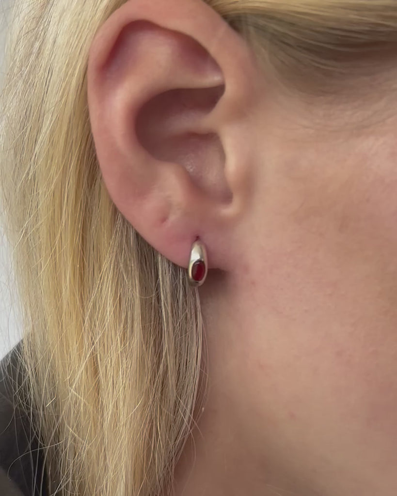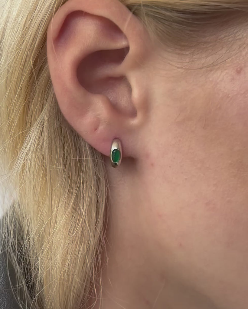 Introducing our very first birthstone huggies Jesper. Like miniature half globes for your ears, these dainty huggies feature a smooth cabochon setting for each birthstone, seamlessly embedded for a sleek, tactile finish. With an easy click-close clasp and our signature unpolished surface, they're ready for everyday comfort and ease.